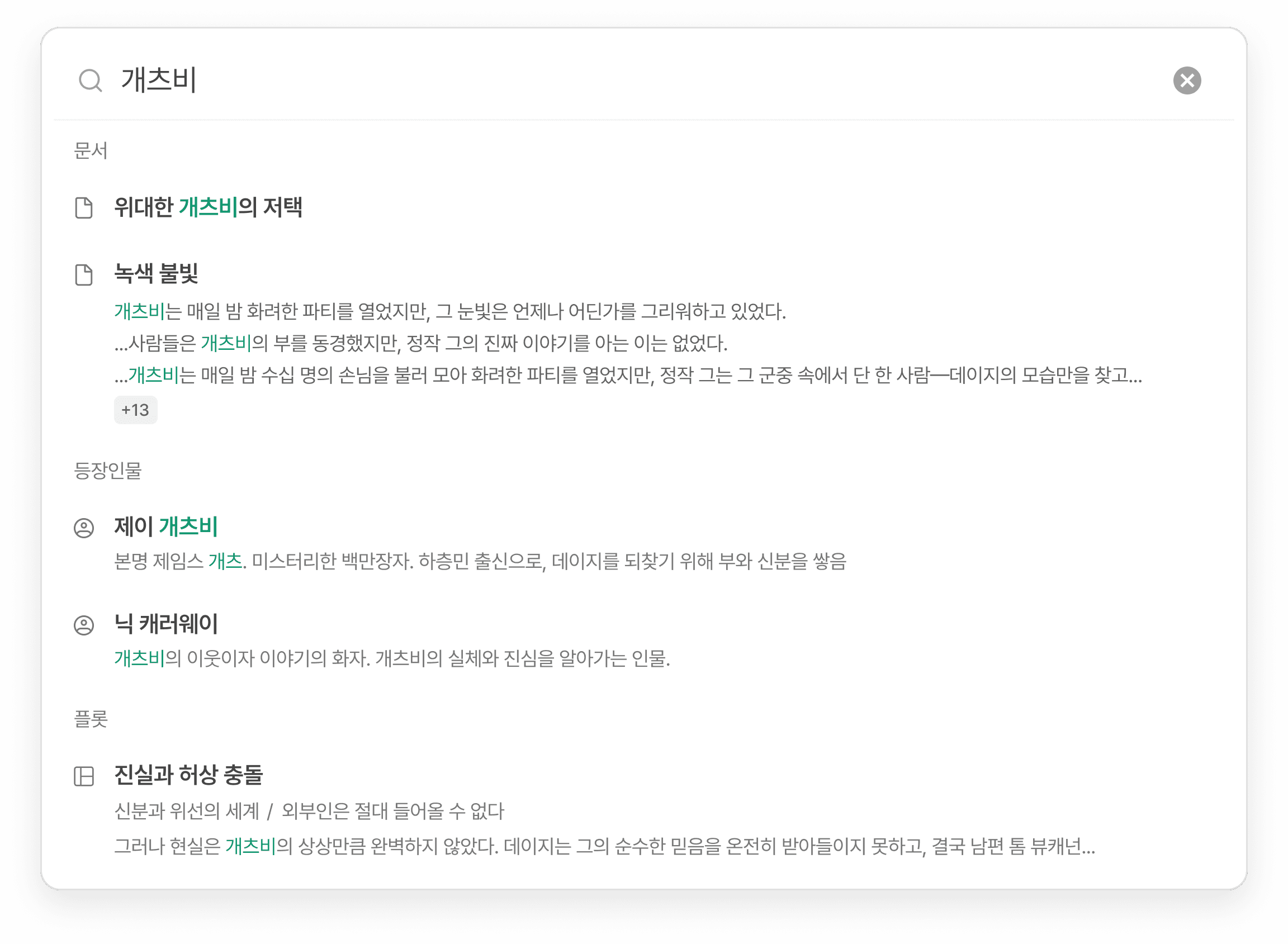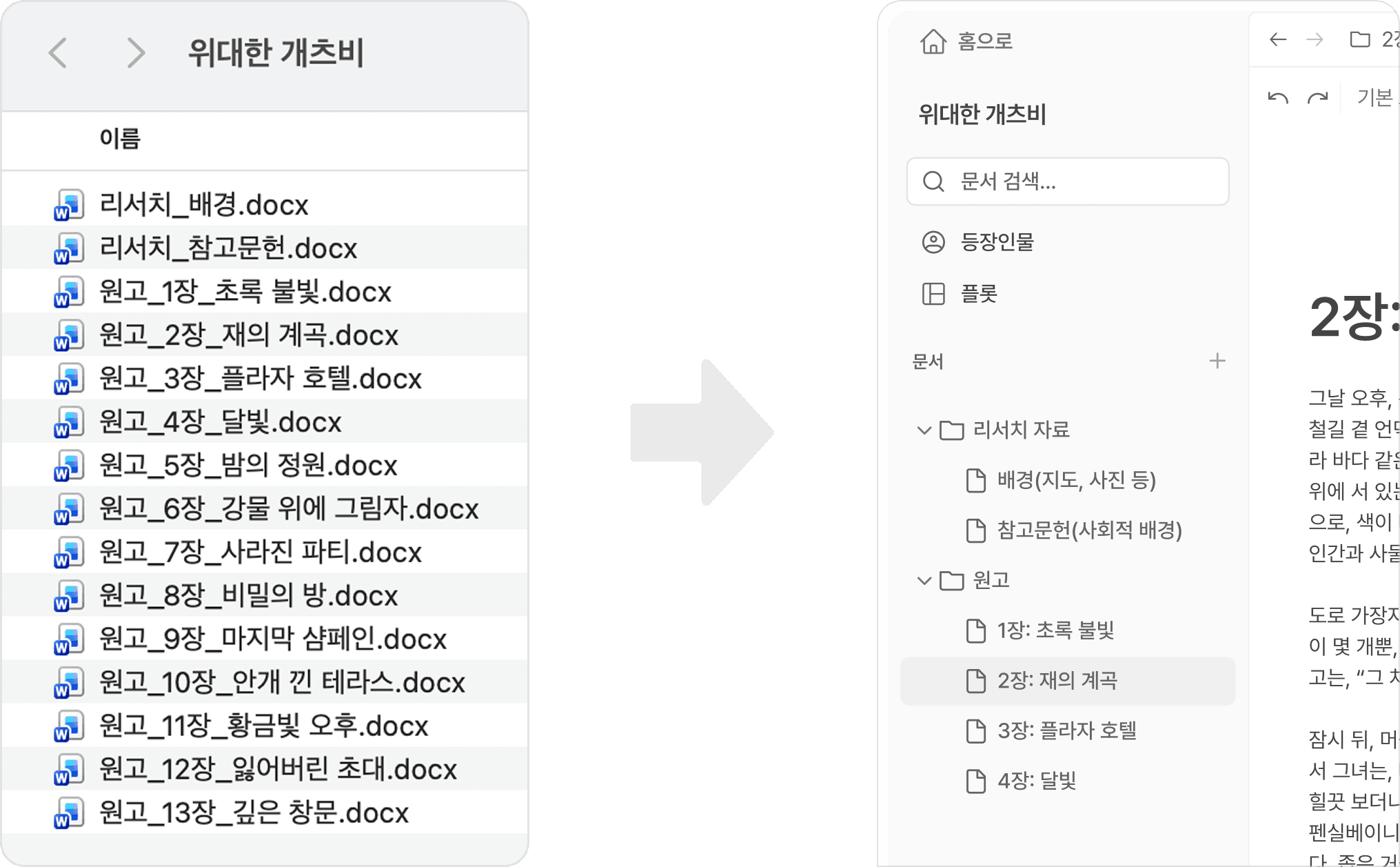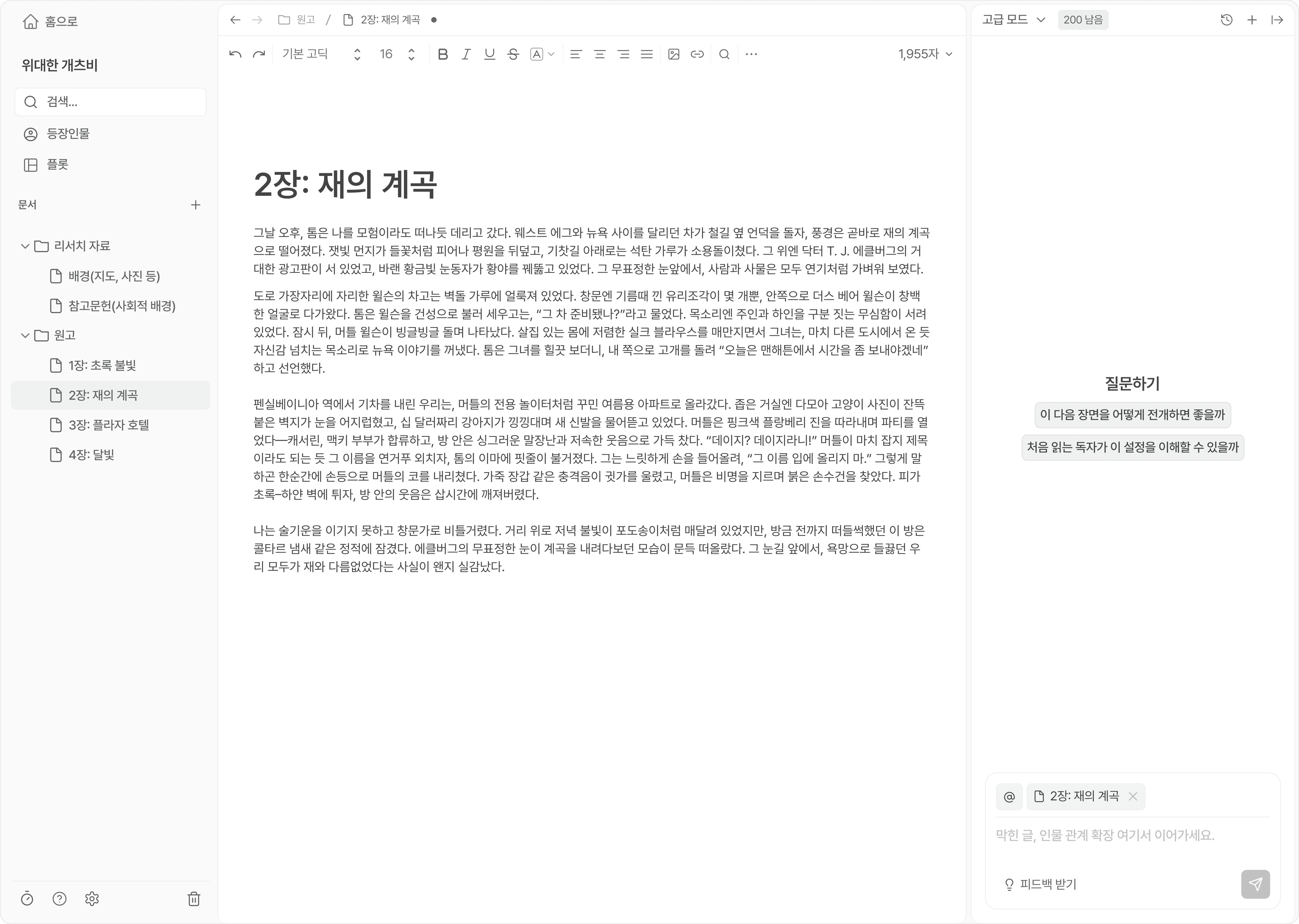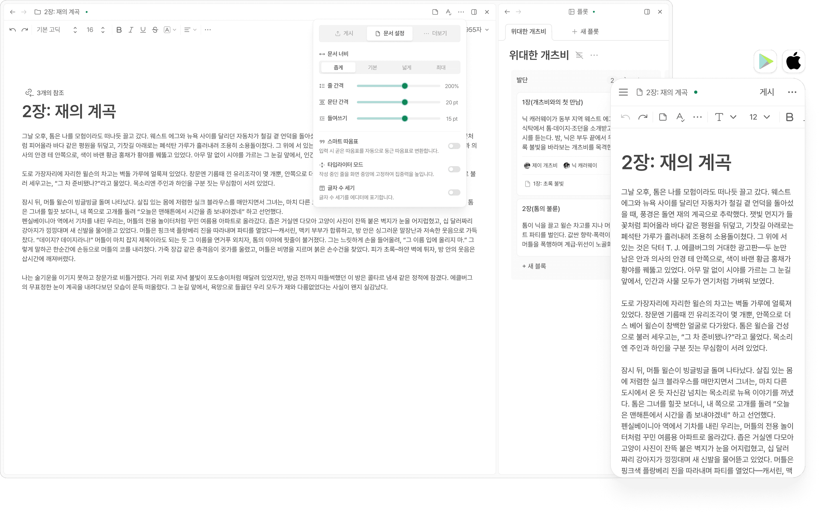 플롯, 인물, 문서가 유기적으로 연결되어 작품에 필요한 모든 요소를 한 공간에서 정리하고 이어 쓸 수 있습니다.