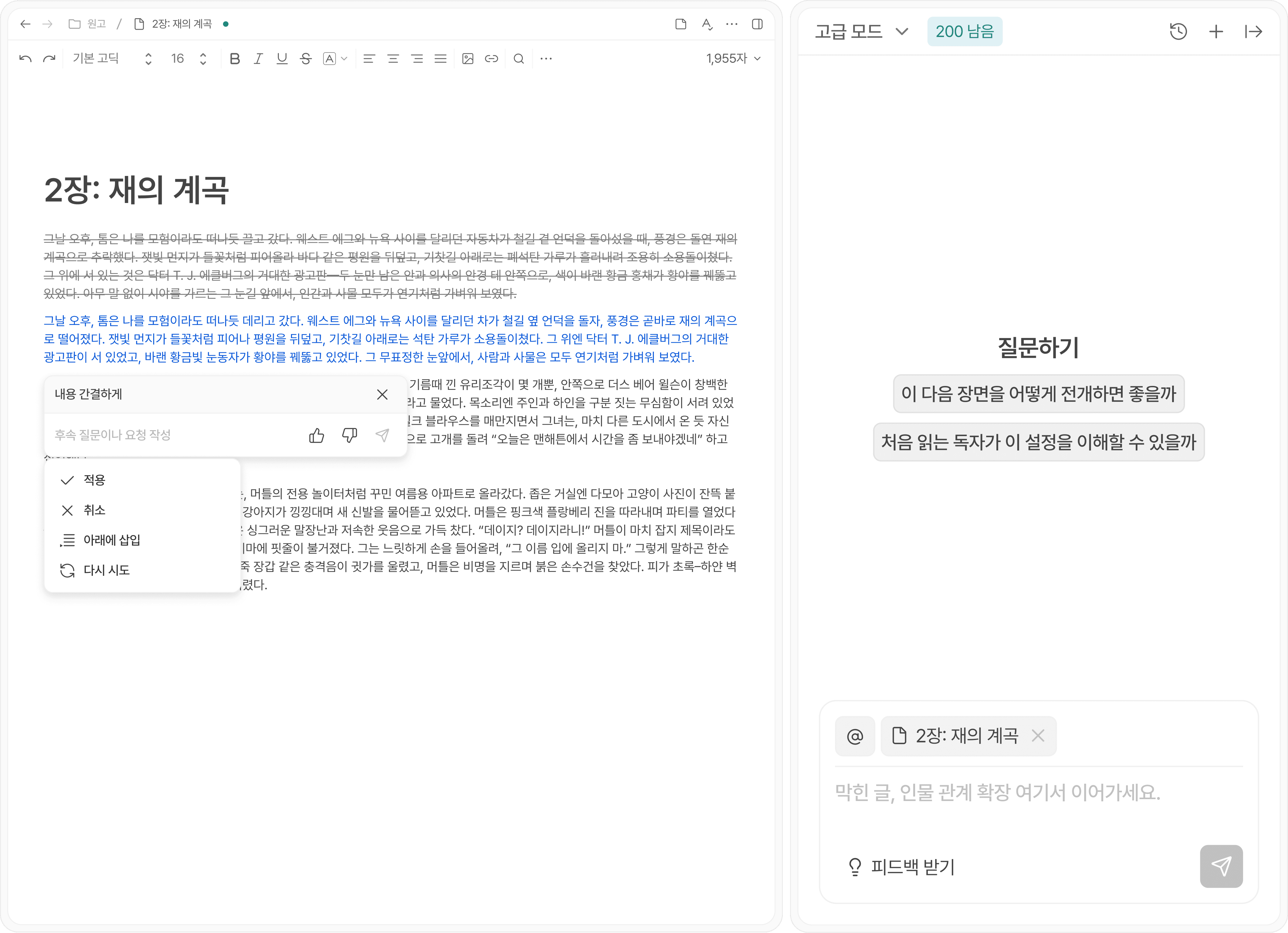 화면을 원하는 대로 수직·수평으로 분할해, 원고와 참고 문서·플롯·메모를 동시에 보고 편집할 수 있어요. 흐름을 끊지 않고 앞뒤 맥락을 놓치지 않으며
