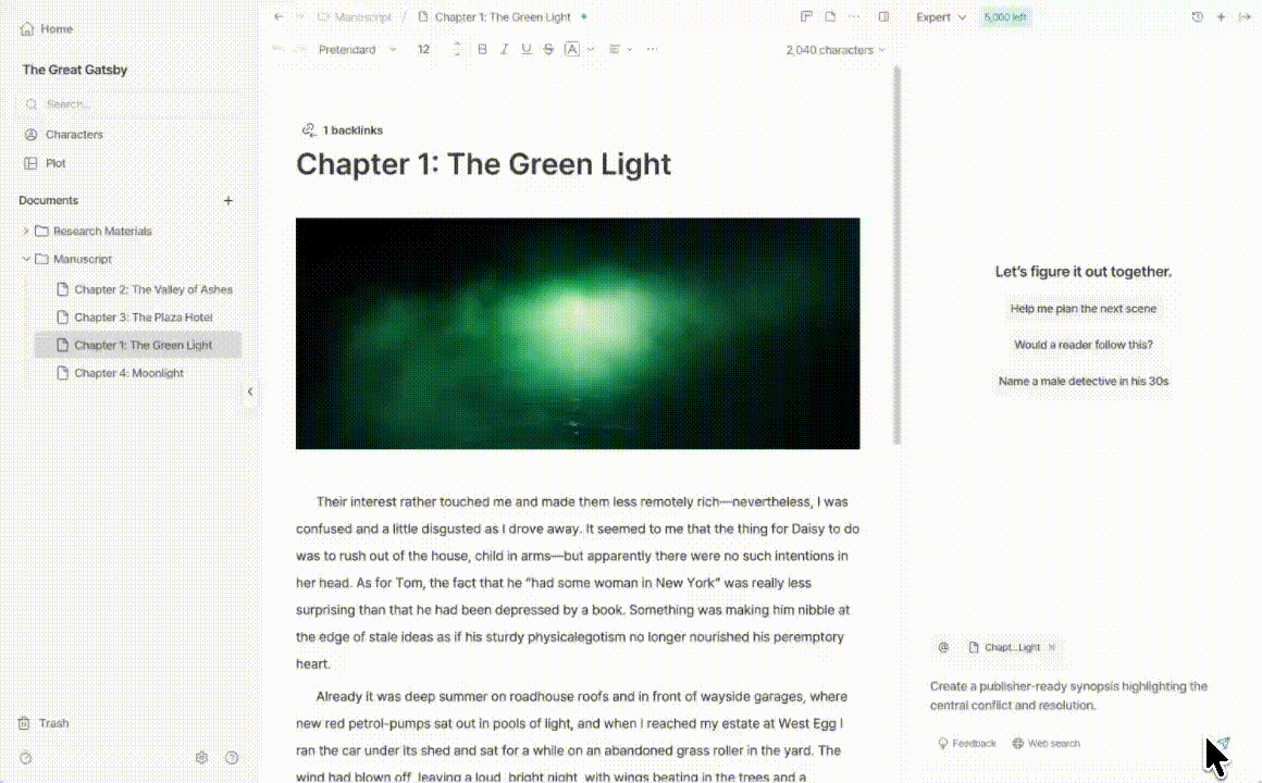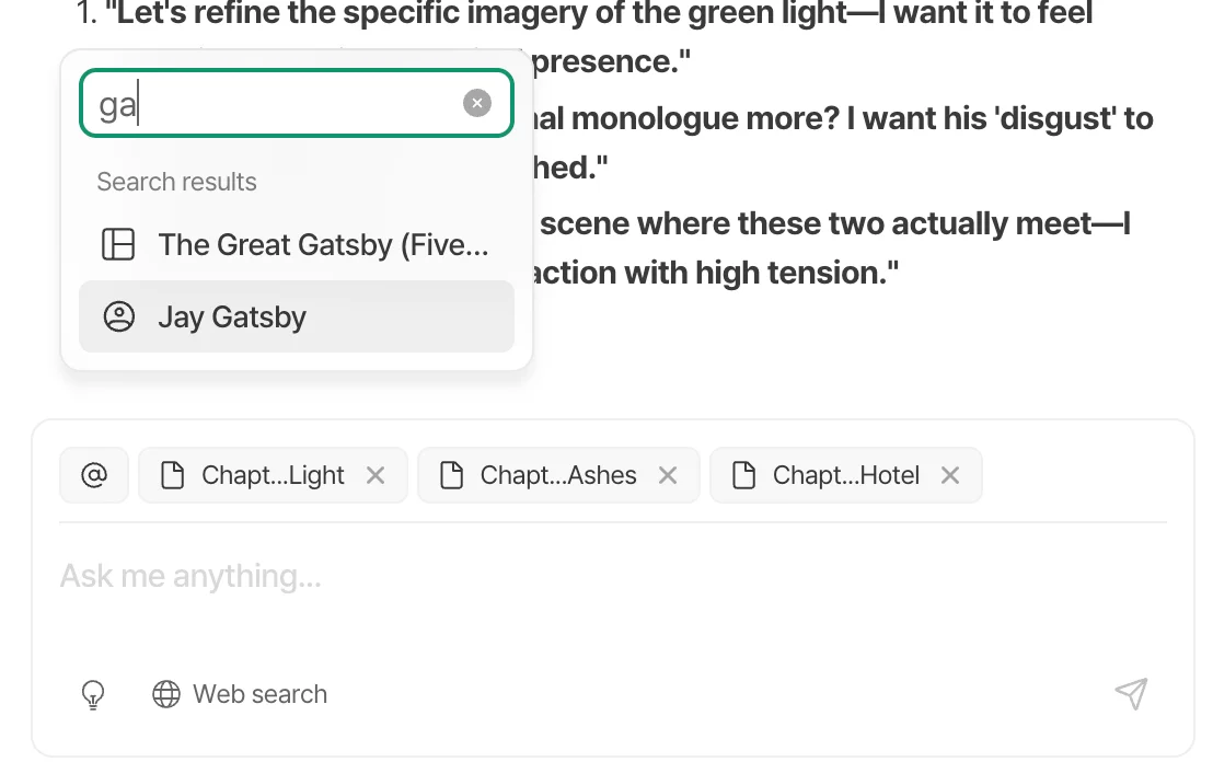 Novela's document reference feature takes this even further. You can point the AI to specific chapters, character notes, or plot outlines and ask it to incorporate those details into your synopsis.