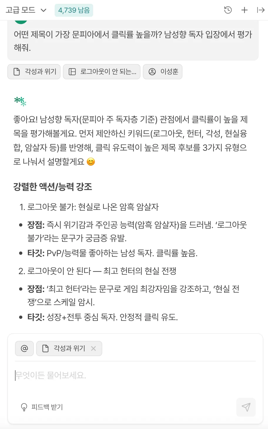문피아에서 매일 수십 편의 신작이 쏟아집니다. 독자들이 스크롤을 내리다 멈추는 순간, 클릭을 결정하는 건 표지도, 첫 회차도 아닌 '제목'이죠.